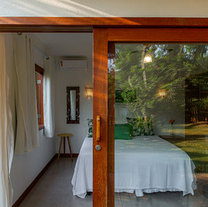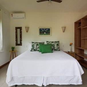 Situada no térreo, nossa Suíte propicia de sua varanda exclusiva uma bela vista do jardim. Ela é ampla, com decoração de bom gosto e super arejada, versátil para acomodar um casal em cama Queen com a possibilidade de uma terceira pessoa em sua cama auxiliar ou duas pessoas separadas em camas de solteiro com bastante conforto. Espaçoso banheiro com secador de cabelo. Conta com um frigobar, ventilador de teto, armário amplo, ar condicionado Split e SMART TV.